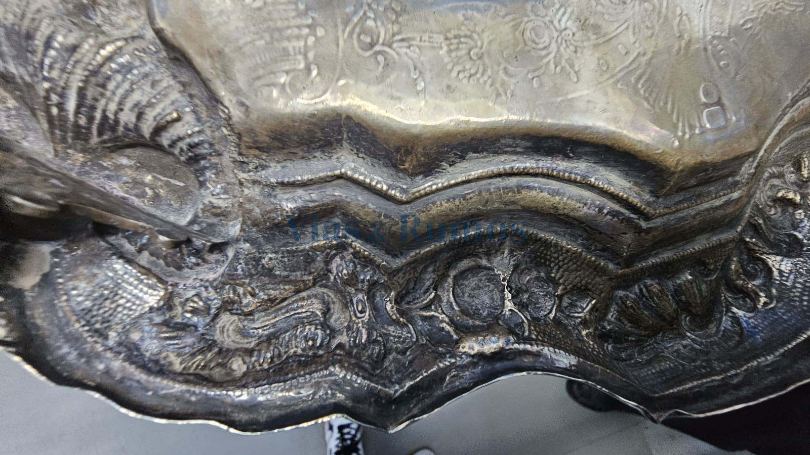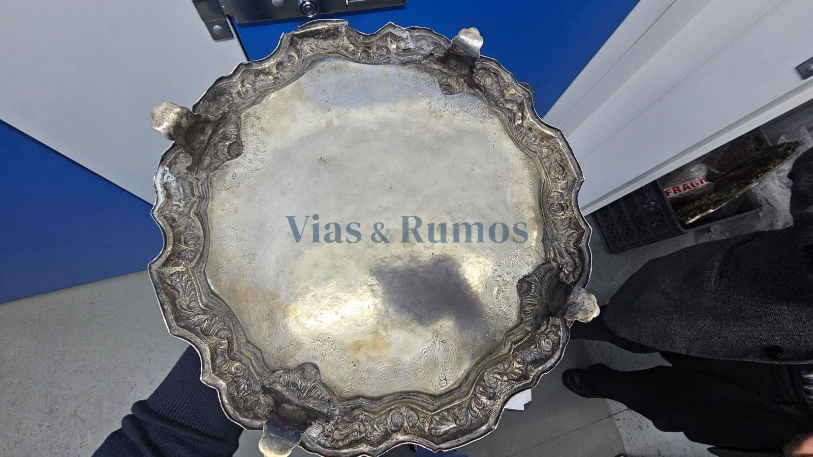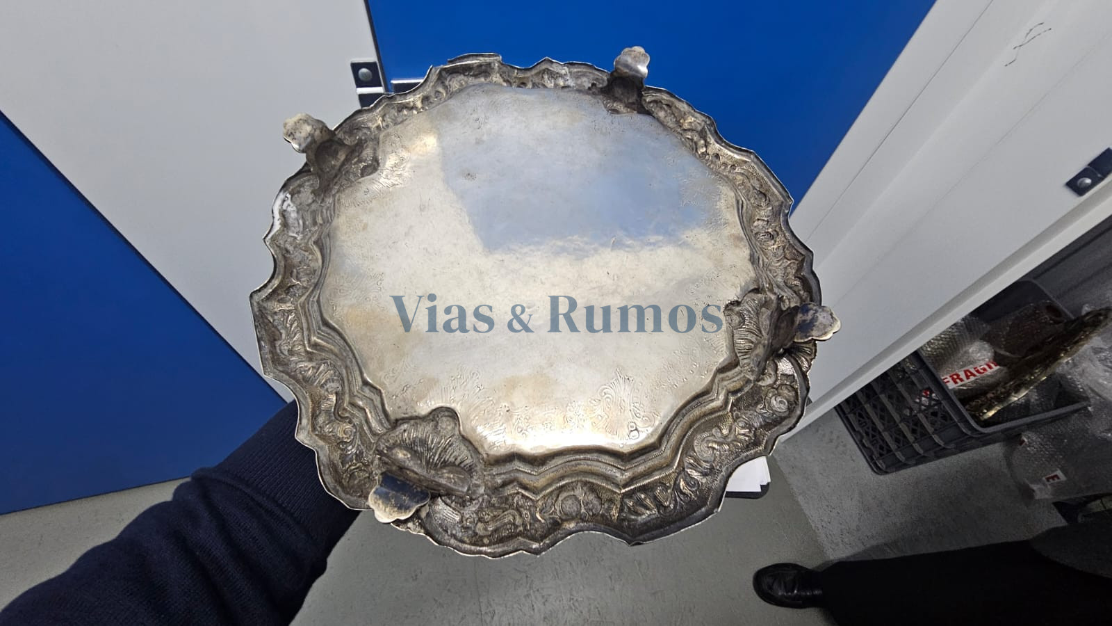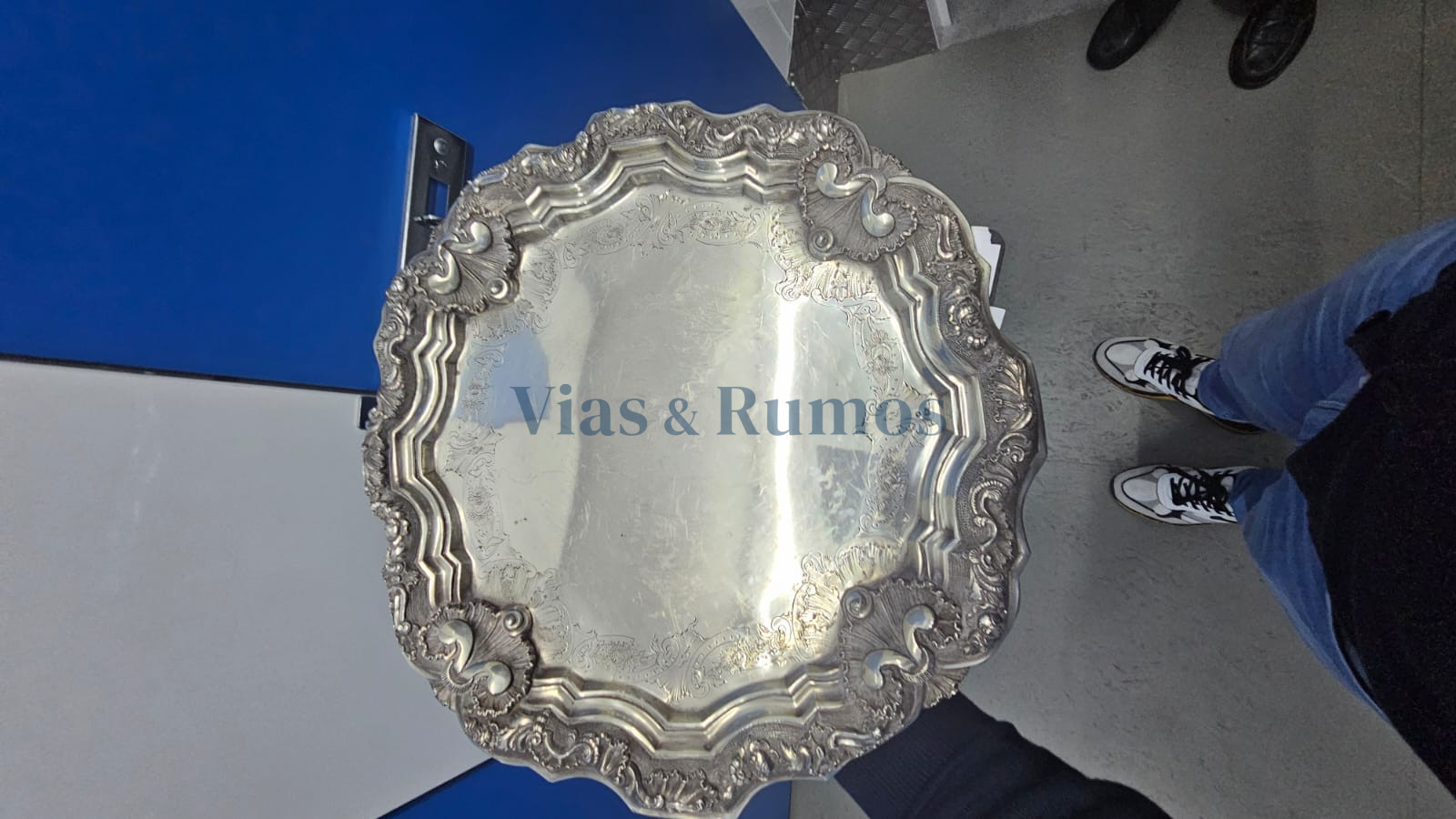 Salva Bilheteira de Grandes. Dimensões em Prata Portuguesa com marca do contraste Javali (1887-1937), teor 833. Com marca de Outives. Decoração repuxada, cinzelada, gravada e vazada. No bordo 6 cartelas não utilizadas. Assente sobre três pés. Diâmetro: 39 cm.