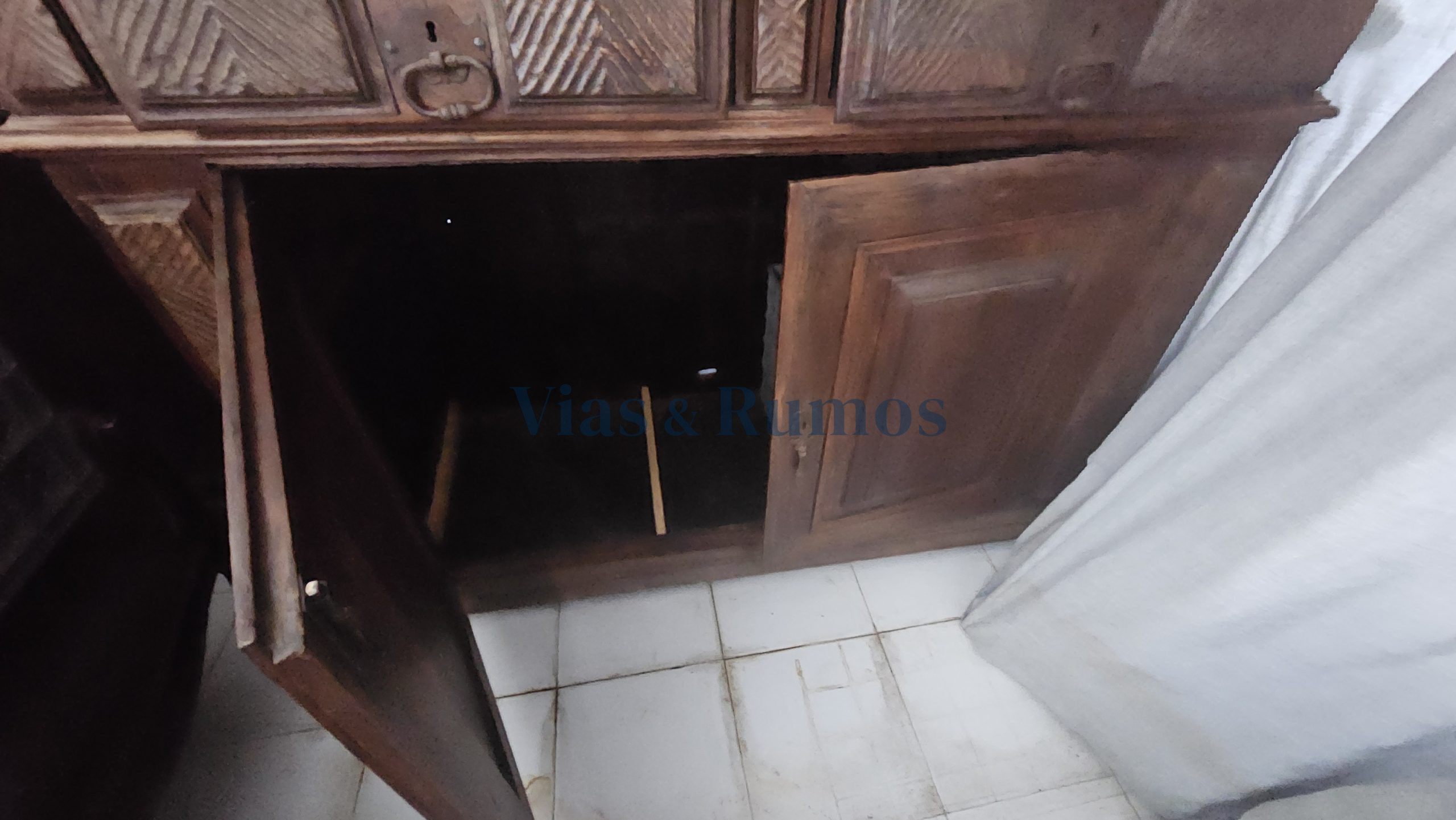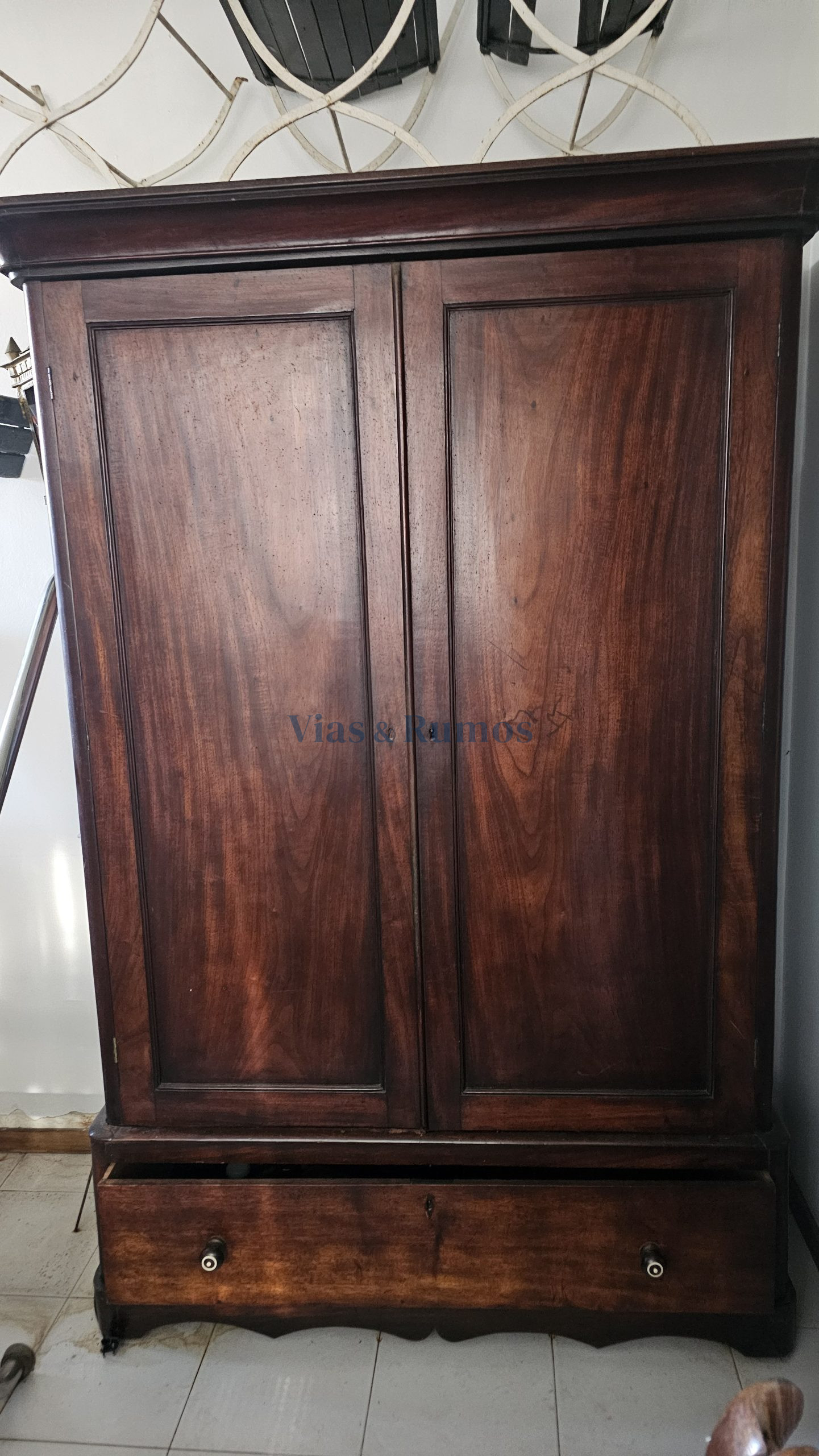 Verba 14: Armário roupeiro – romântico, Inglês ou ao seu gosto, em madeira de Mogno, com duas portas encimadas por cimalha, abrindo para roupeiro com um gavetão. Valor 300,00€