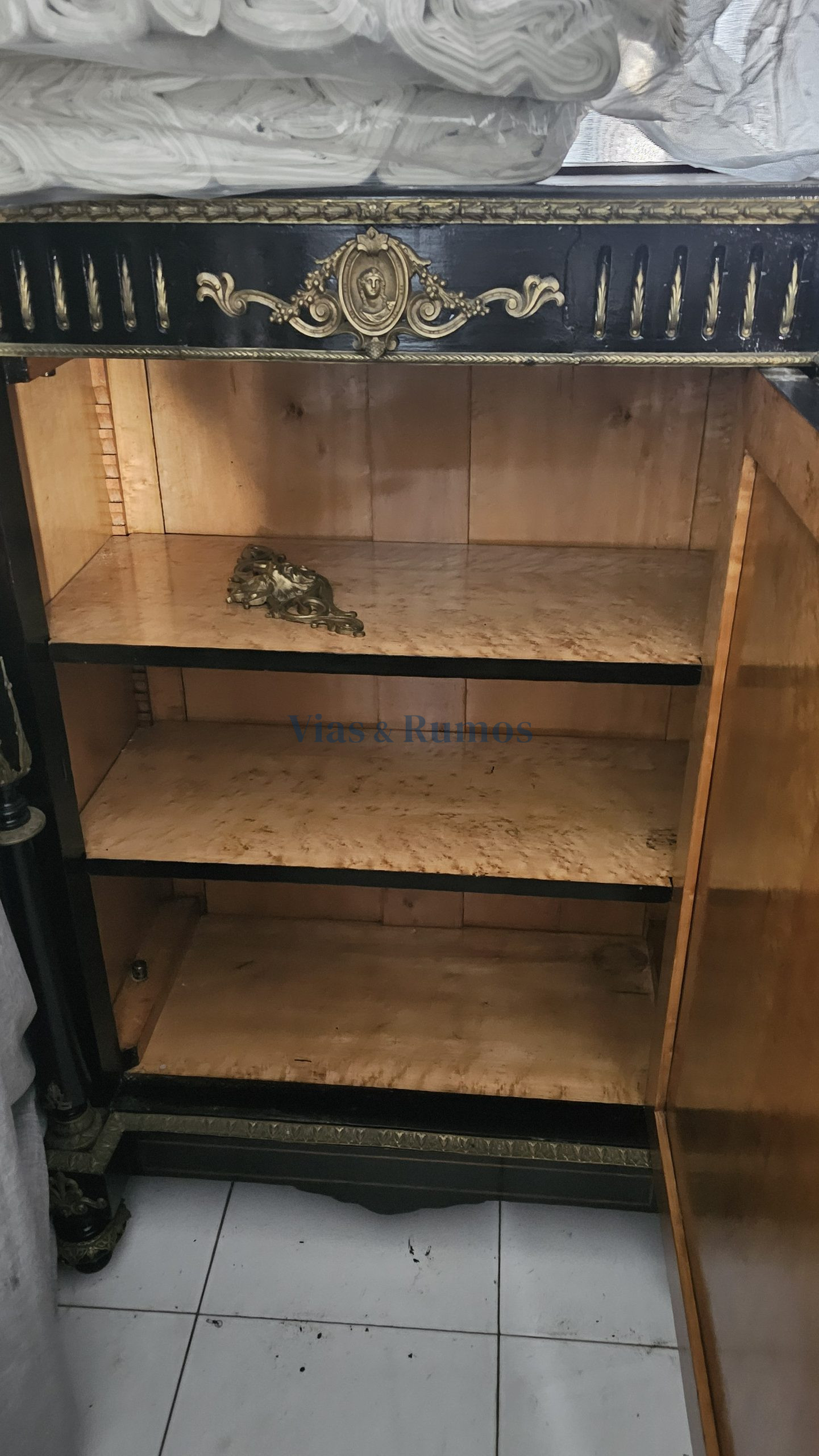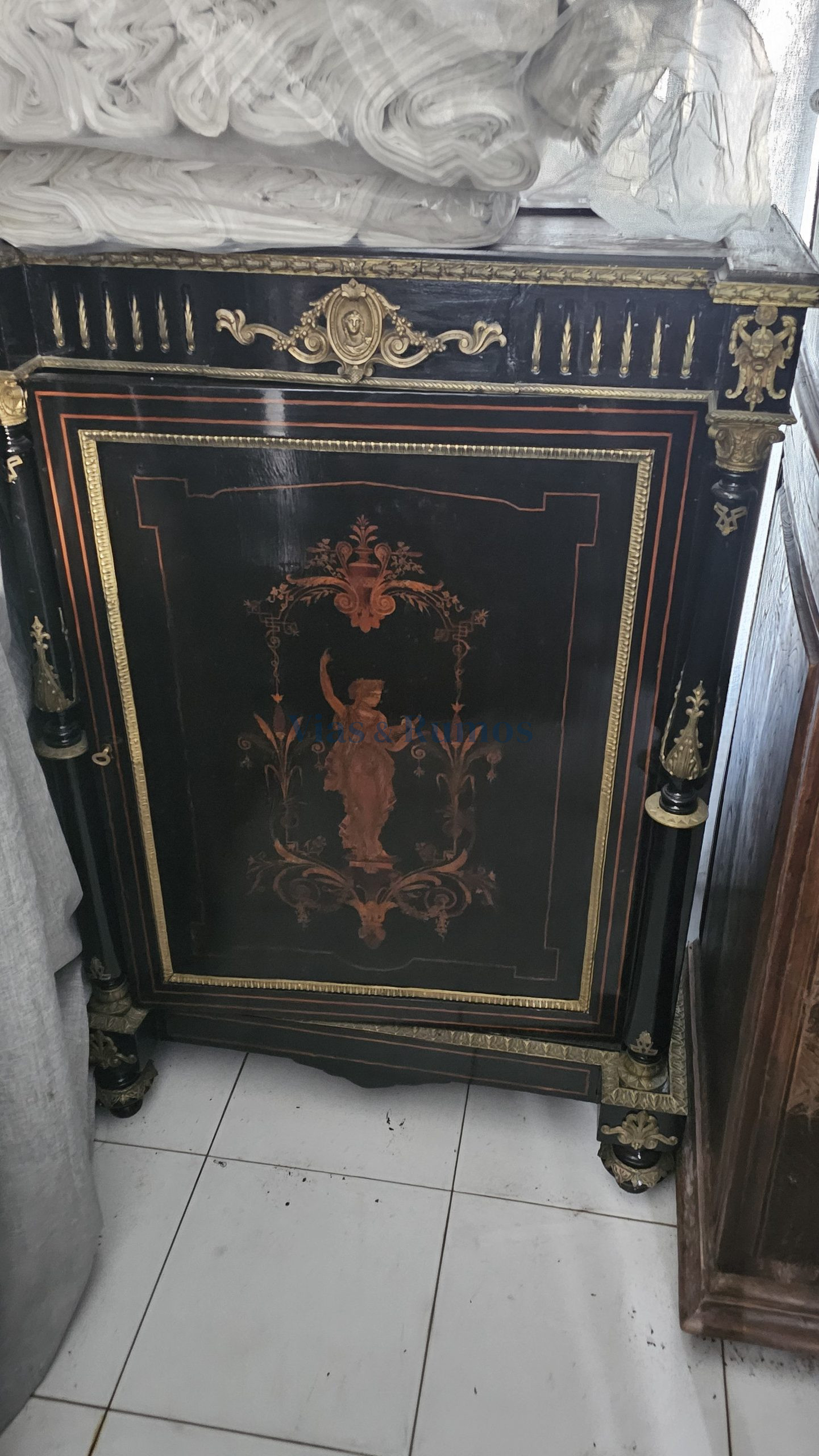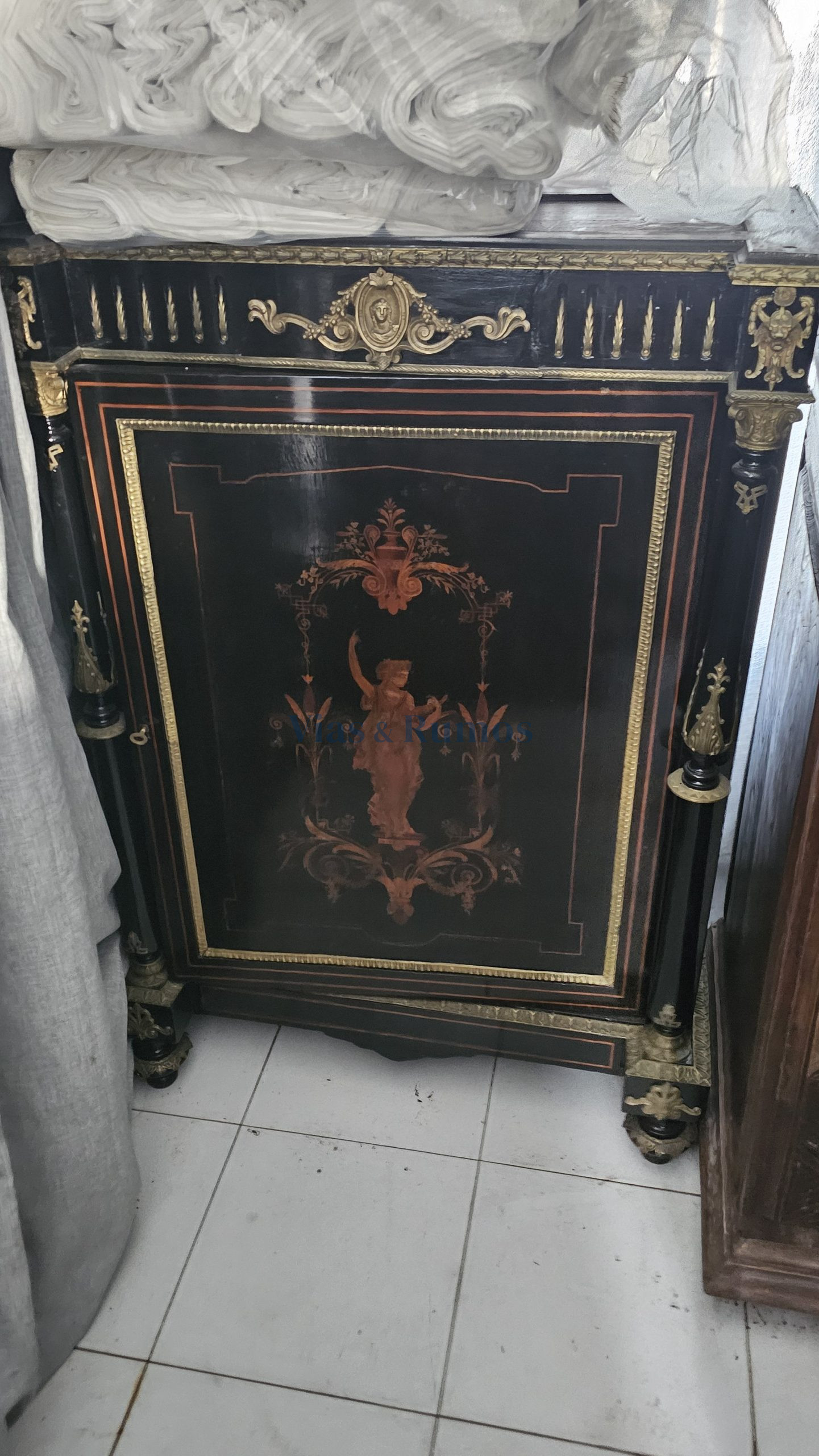 Verba 16: Armário Napoleão III, em madeira de carvalho Francês e “olho de Perdiz”, com exterior em verniz francês de cor negra e embutidos em Pau-Cetim. Aplicações em bronze, parcialmente dourado. Com uma porta e saial. Valor 800,00€