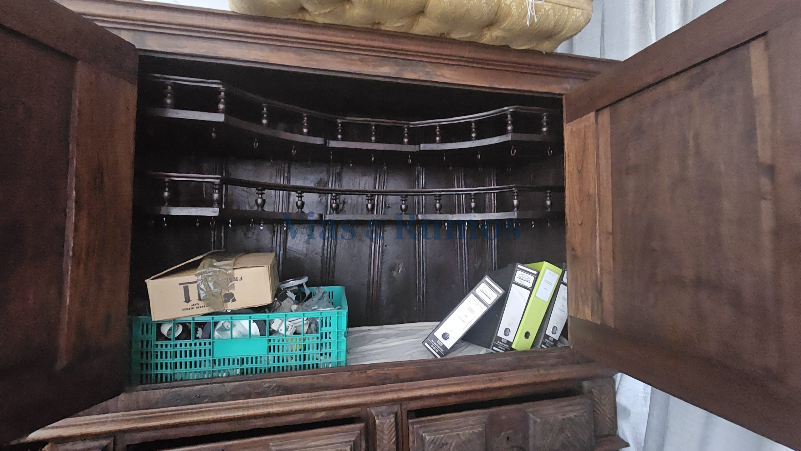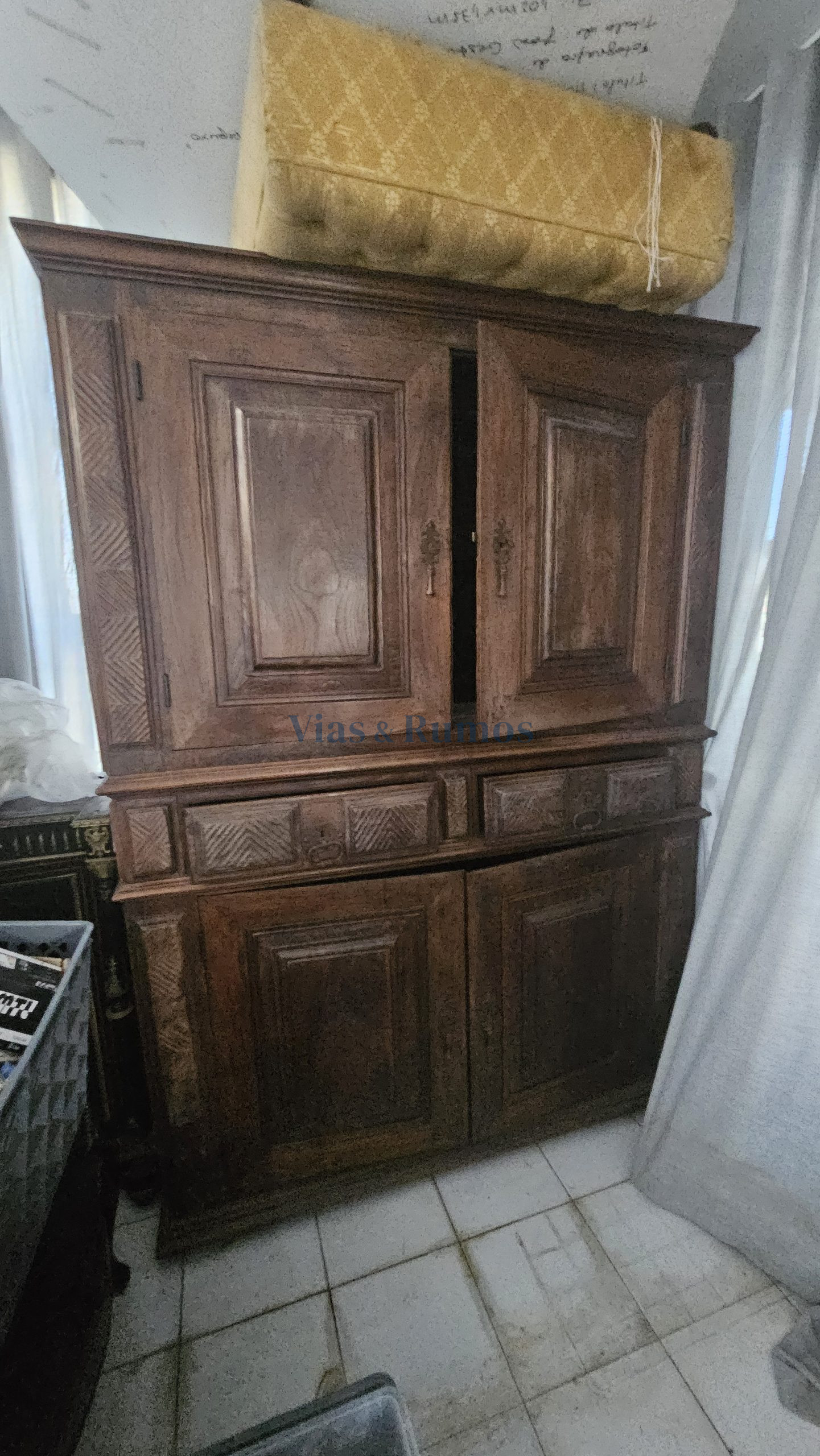 Verba 17: Armário louceiro de dois corpos, cada um com duas portas abrindo para prateleiras, uma com varandim, e duas gavetas, português do Séc. XVII em madeira de castanho. Valor 500,00€
