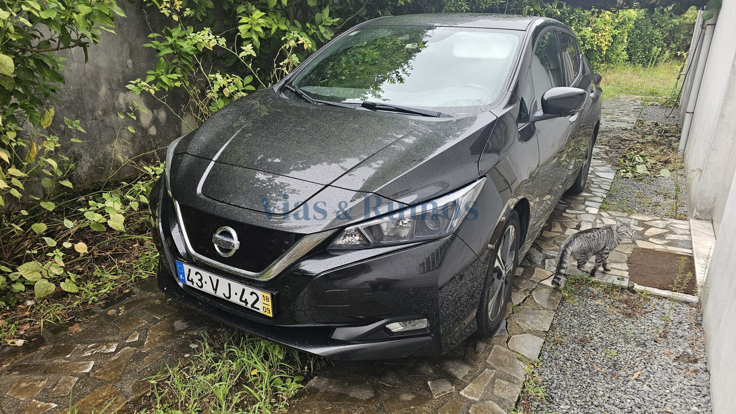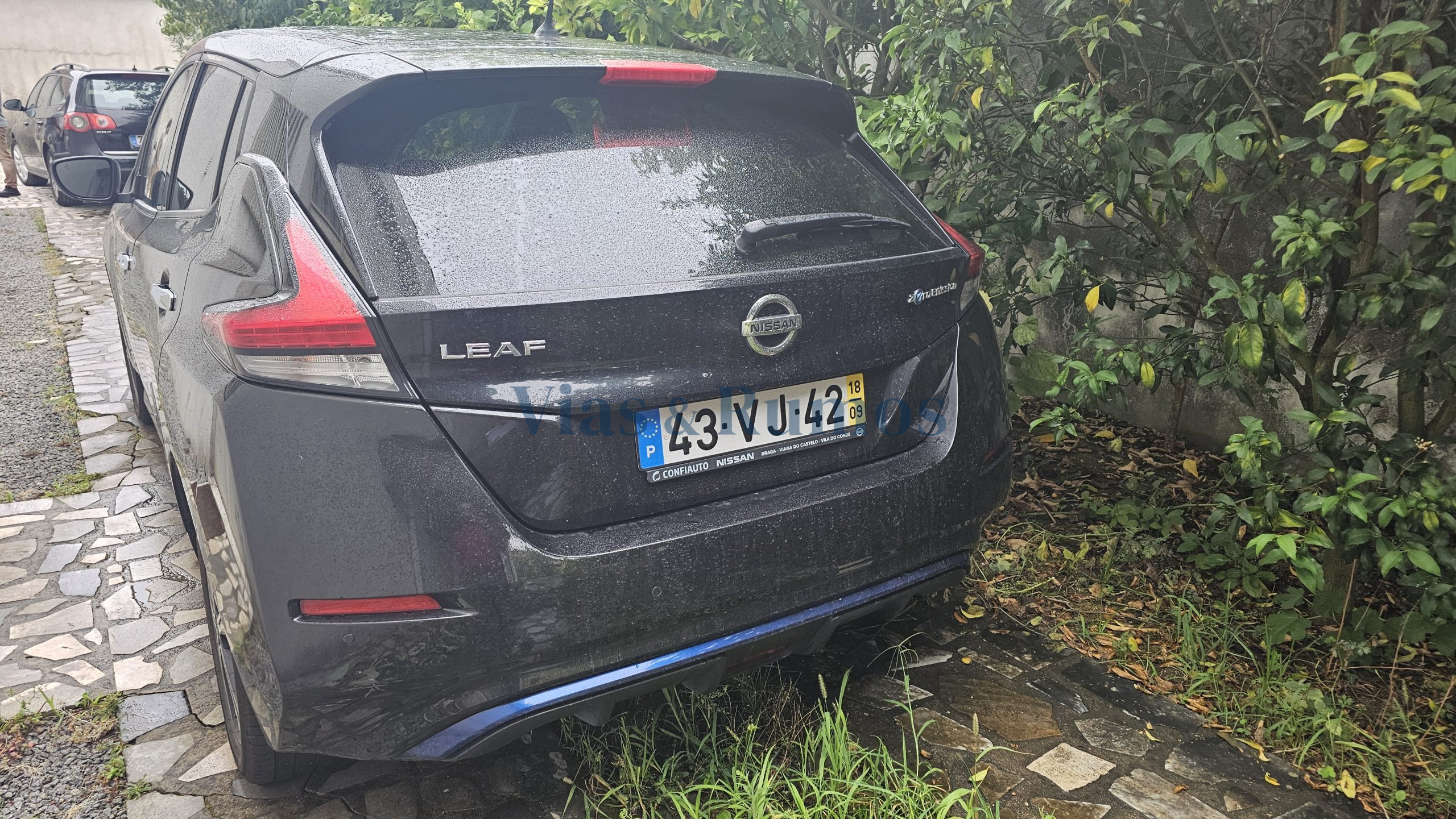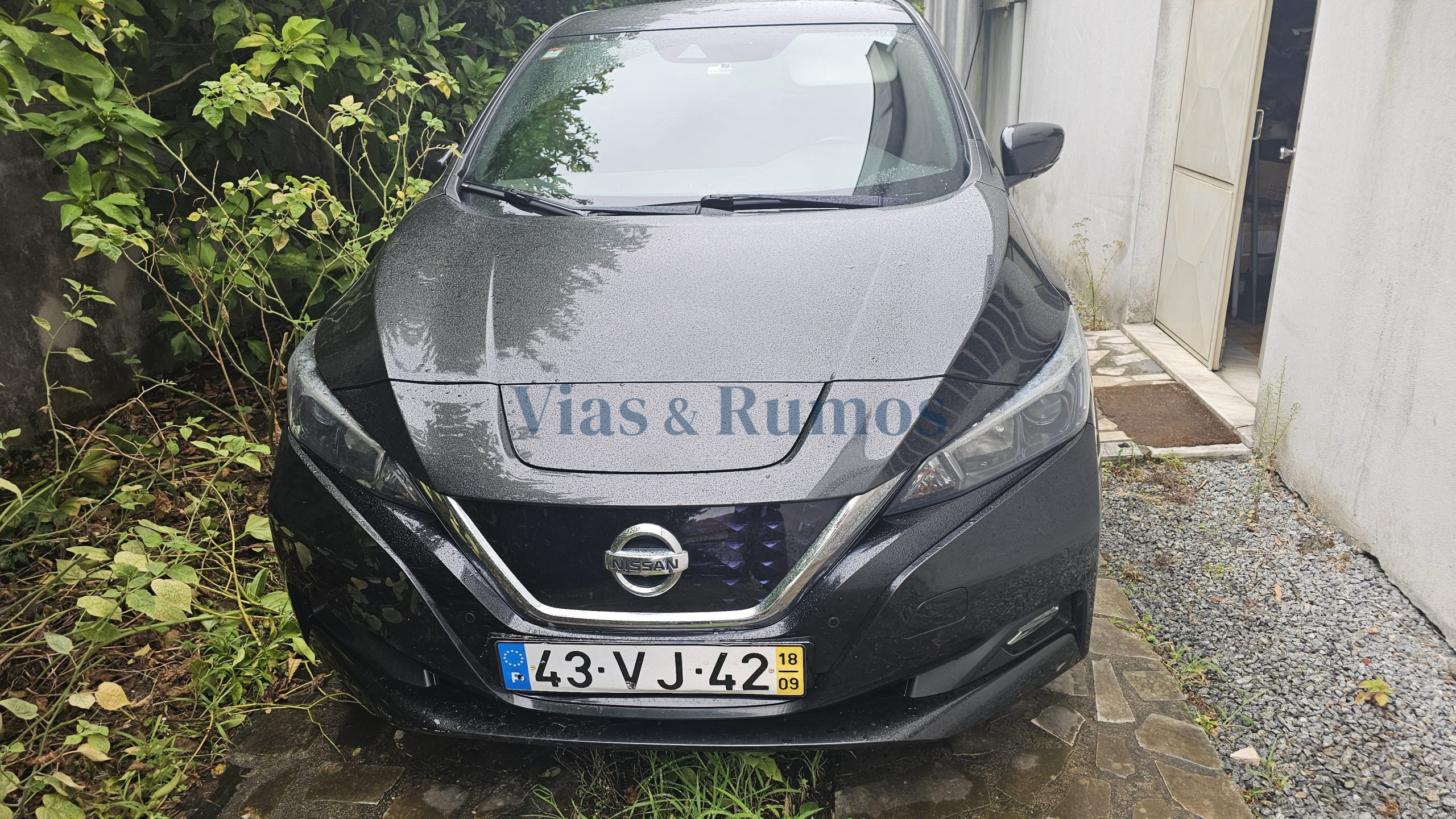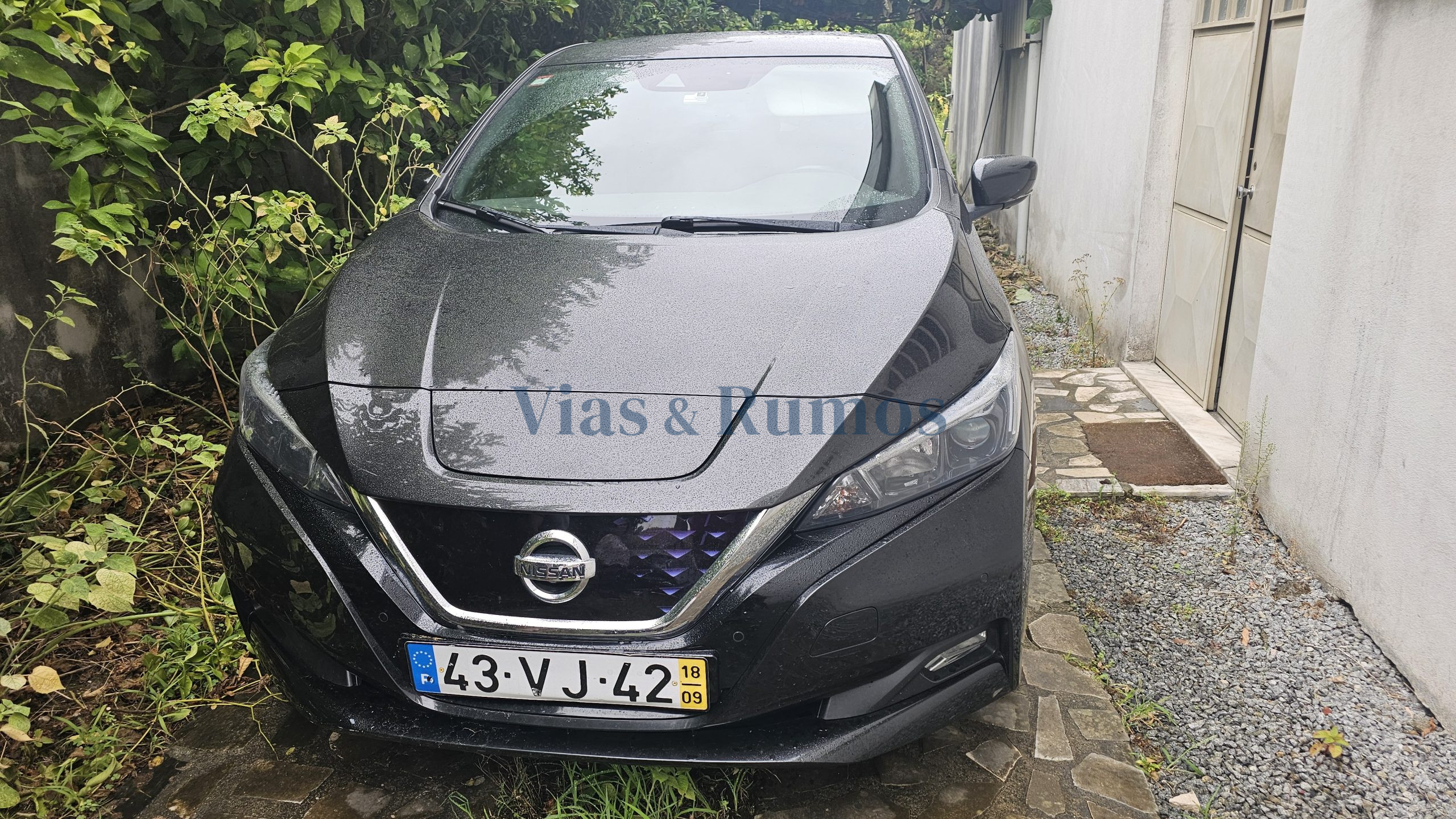 Veículo automóvel, ligeiro de passageiros, marca Nissan, modelo LEAF, do ano 2018, cor preto, elétrico, com a matrícula 43-VJ-42.